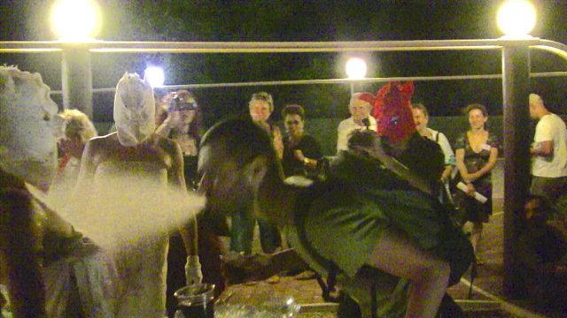 Backfabrik, Saarbrucker Str. 36, Prenzlauerberg, Berlin. (as part of the Changing Channels London Biennale Pollination) a former baking factory courtyard becomes a poetic phallus in the gold wrapping of three Turkish bread faced and ashes covered naked people whose mask slowly decomposes under a waterfall, golden beads are pulled from their mouths and the libertines drive off in cars.