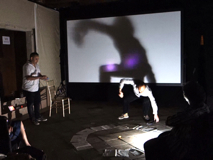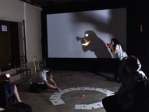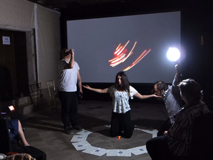 Performance by Adrian Fisher, Luna Montenegro, Ginés Olivares. thoughts as orbits - inspired by 'a point beats in space. Listen' Edmond Jabes, The Book of Questions, Volume II, 1967. Voice, video projection, shadow. Rituals, poetry and sounds from outer space. Materials: Live sound from Venice canal, synthesisers, 5 speaker audio distribution, 2 x microphones, music score, mini-drone.